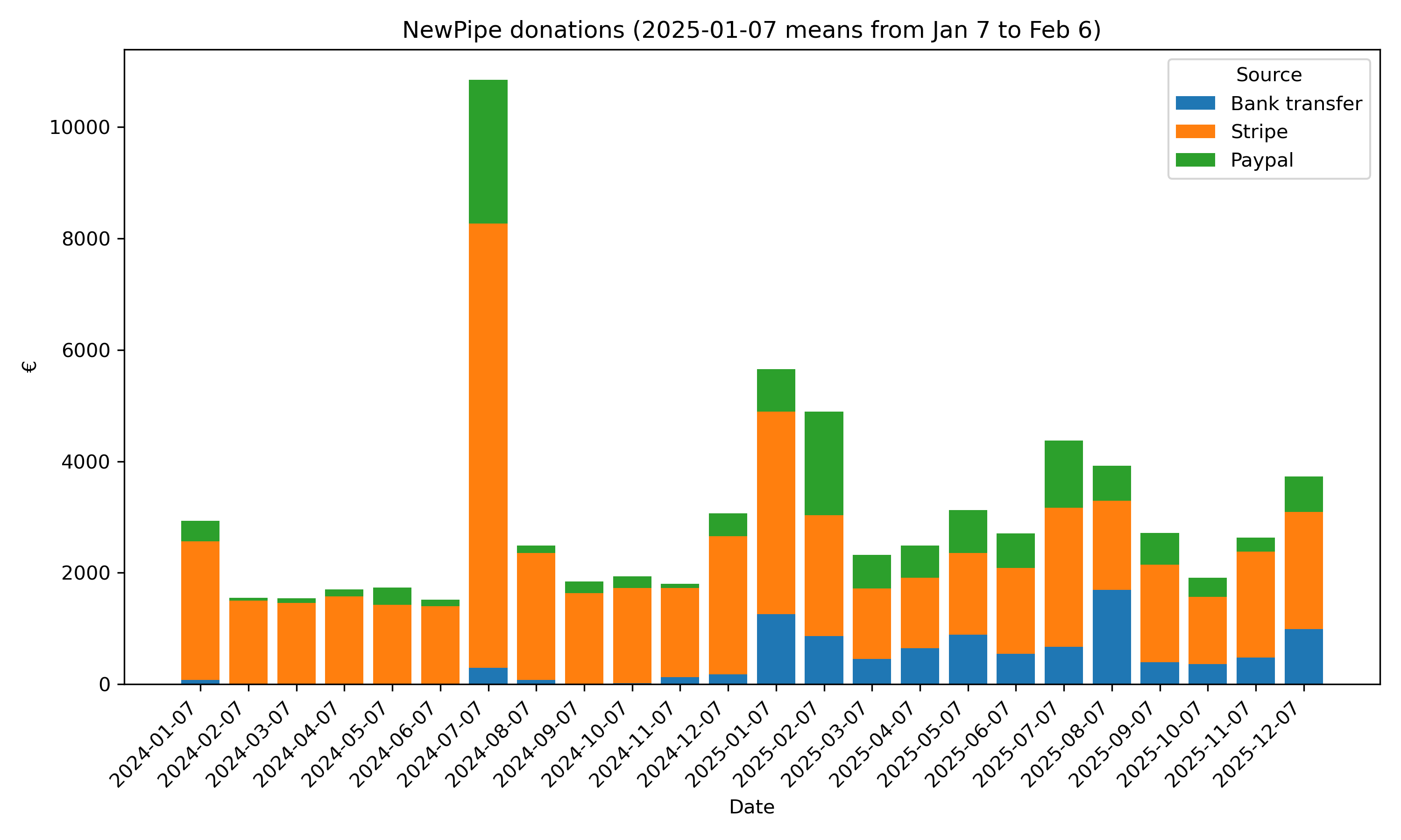 Fynn projects that we will still be getting 40000€ of donations during 2025, and Stypox supports his idea by showing the following graph. Stypox explains that the increase in bank transfer donations at the beginning of 2025 was because we added our IBAN to the websites's donation pages. Futhermore, the spike of donations in July 2024 was due to the NewPipe app being broken for a week or so, and people donated to help out.